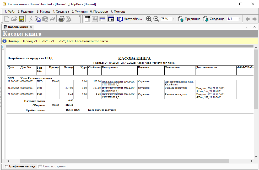 Търговска система - Справка Касова книга за портфейл Каса Разчети тол такси показва детайли за всяко движение на паричните средства при разчети за тол такси и услуги.