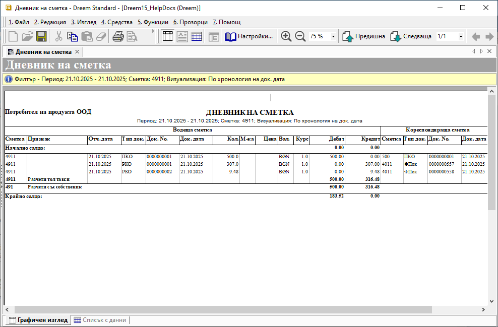 Счетоводство - Справка Дневник на сметка за с/ка 4911 показва счетоводни данни за всяко движение на паричните средства, свързани с разчети за тол такси и услуги.