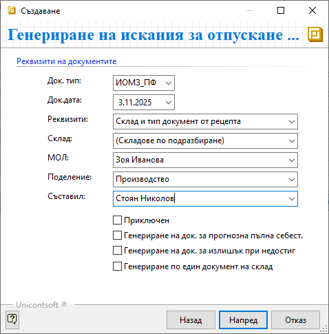 Подходящата опция в случая е Склад и тип документ от рецепта. При нея генерацията взема предвид настроените в рецептата на полуфабриката склад на изписване и тип складов документ за всяка суровина.Приключен - Изберете дали да поставите отметка, с което ИОМЗ_ПФ автоматично ще се приключи. В обратния случай документът остава в редакция и позволява да нанесете корекции.