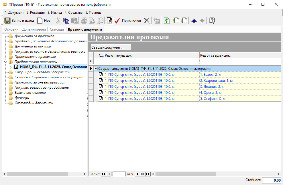 Може да се навигирате до новосъздадения ИОМЗ_ПФ от раздел Връзки с документи на протокола за производство или от списък с документи.