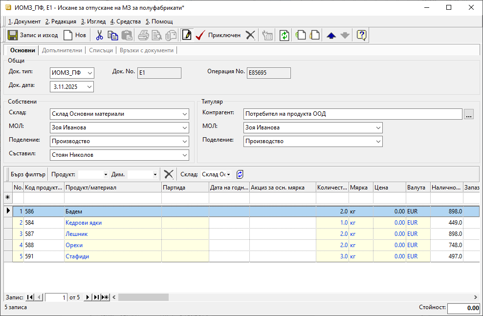 С това участващите в документа суровини се изписват от съответния склад. Тъй като ИОМЗ_ПФ е разходен тип складов документ, след валидиране автоматично се обзавежда със среднопретеглени цени за склада.