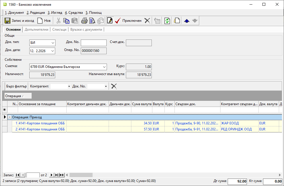 На следващ етап въвеждате в системата банково извлечение с постъпилите картови плащания. В документа използвате основание за плащане 4141-Картови плащания ОББ. Задължително в поле Свързан документ посочвате продажбите, отговарящи на всяка банкова трансакция.