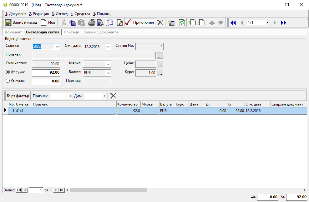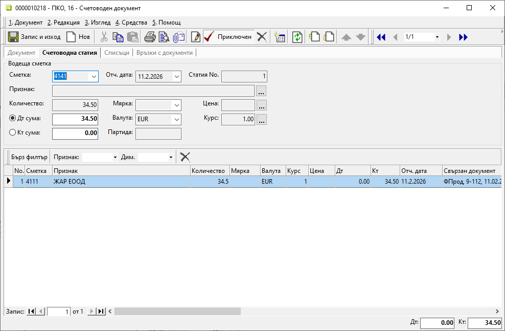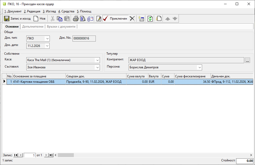 С това се закрива вземането по свързания в ПКО данъчен документ, докато свързаната продажба остава неплатена. Нейният остатък за плащане ще бъде закрит при въвеждане на банково извлечение с получената сума по банкова сметка.