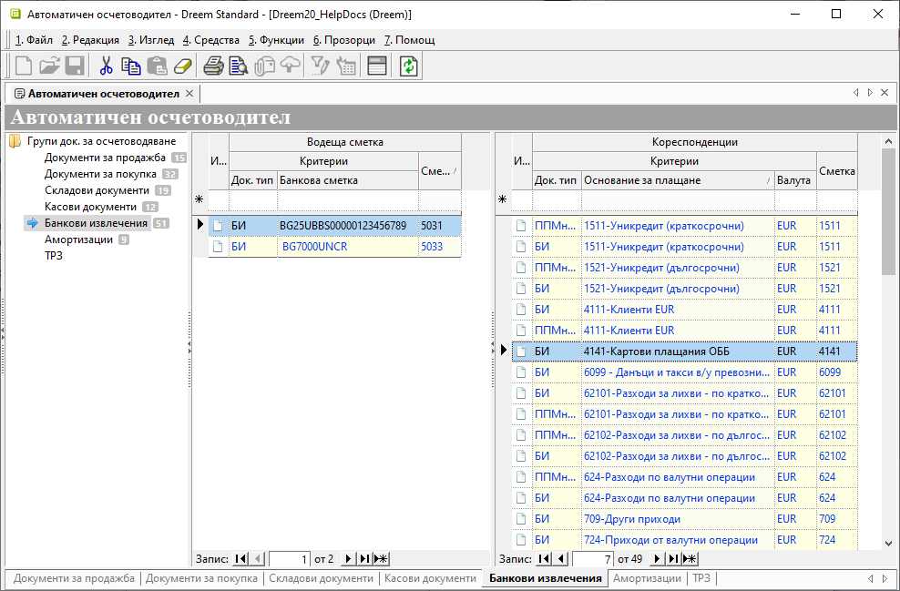 В раздела за банкови документи от секция Водеща сметка трябва да имате настройка за всяка банкова сметка, с която оперирате.