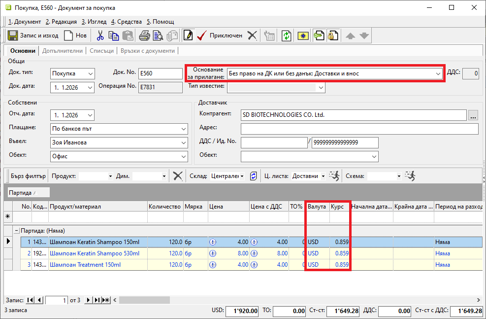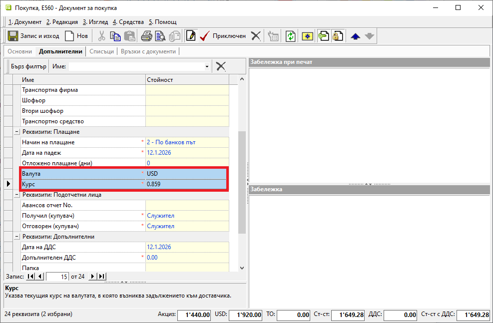 Валутните сделки се въвеждат в системата като стандартни покупки. Единствените реквизити, които се различават, са: