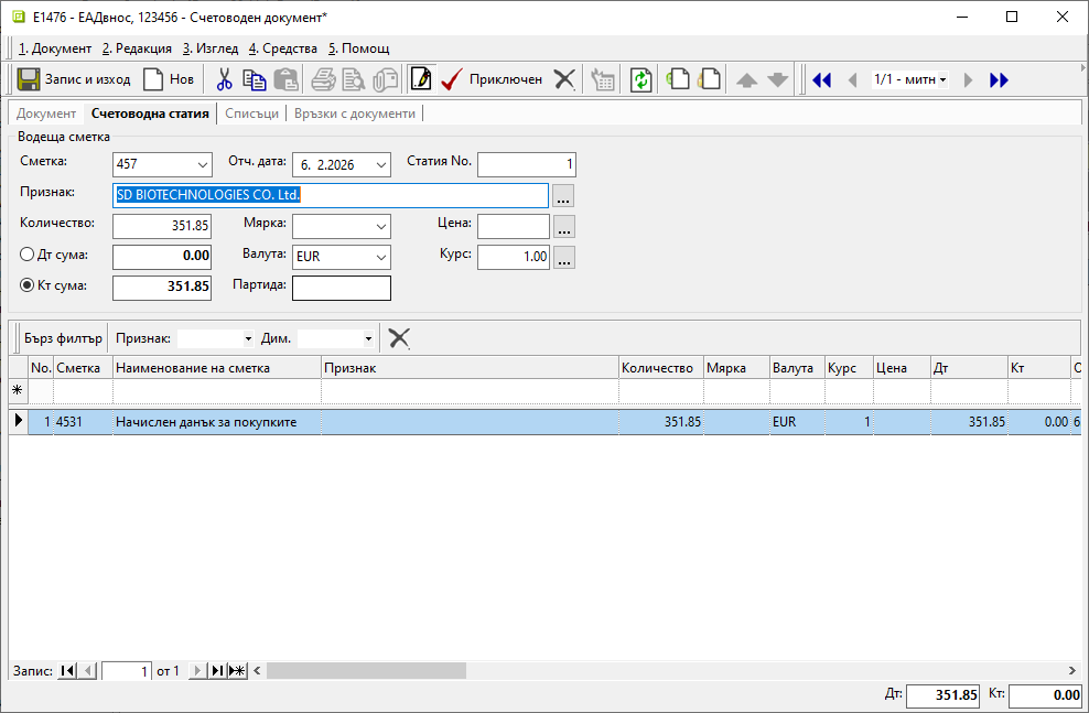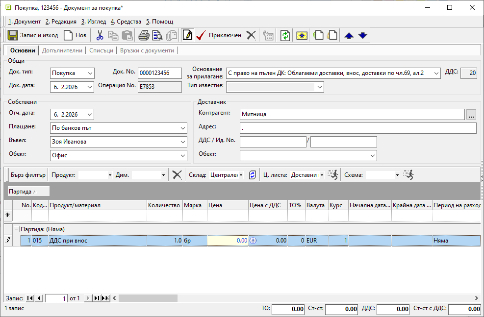 На реда за добавяне на нов запис се избира настроен за случая продукт ДДС при внос с количество 1 брой.