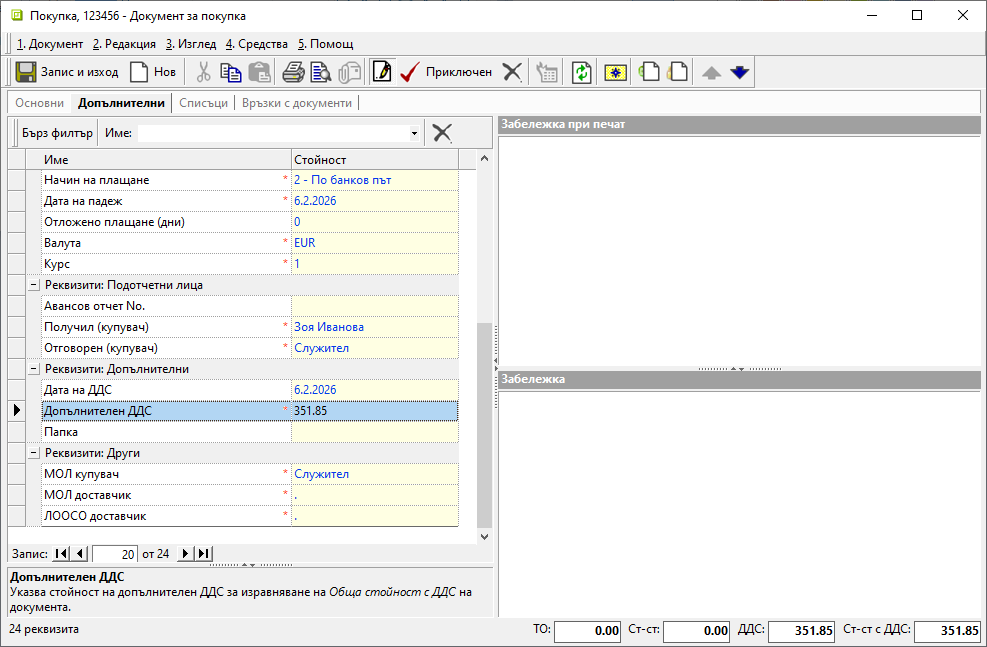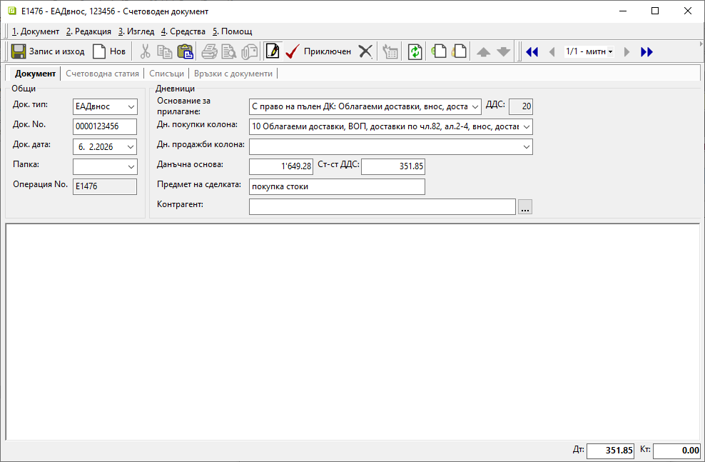 Счетоводният документ трябва да бъде приключен. С това данните се регистрират в счетоводни справки и Дневник за покупките.