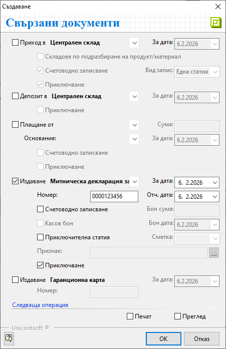 Документът се приключва. От форма Свързани документи се генерира Митническа декларация за внос (ЕАДвнос) с Приключване. На този етап не се създава счетоводно записване.