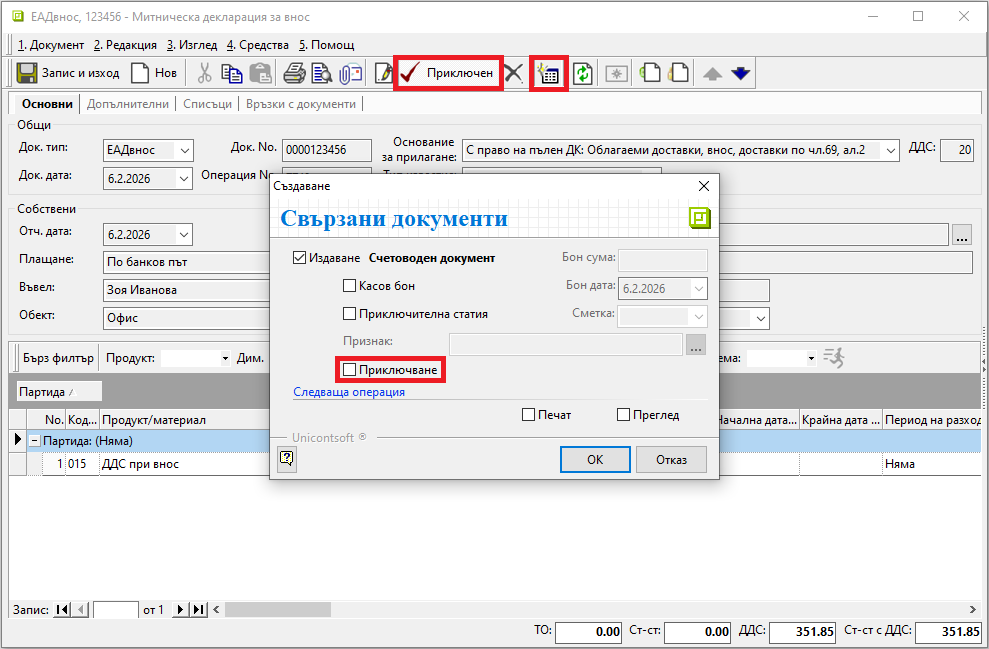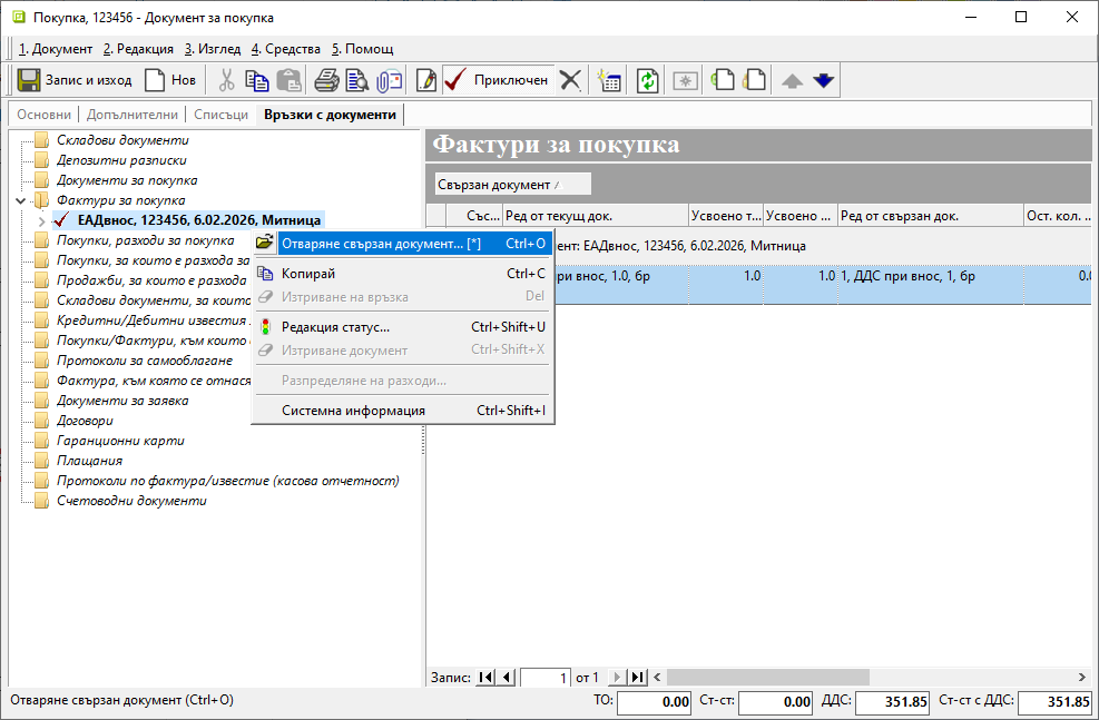 За целта се отваря ЕАДвнос-Митническа декларация за внос. Документът е лесно достъпен от раздел Връзки с документи в покупката.