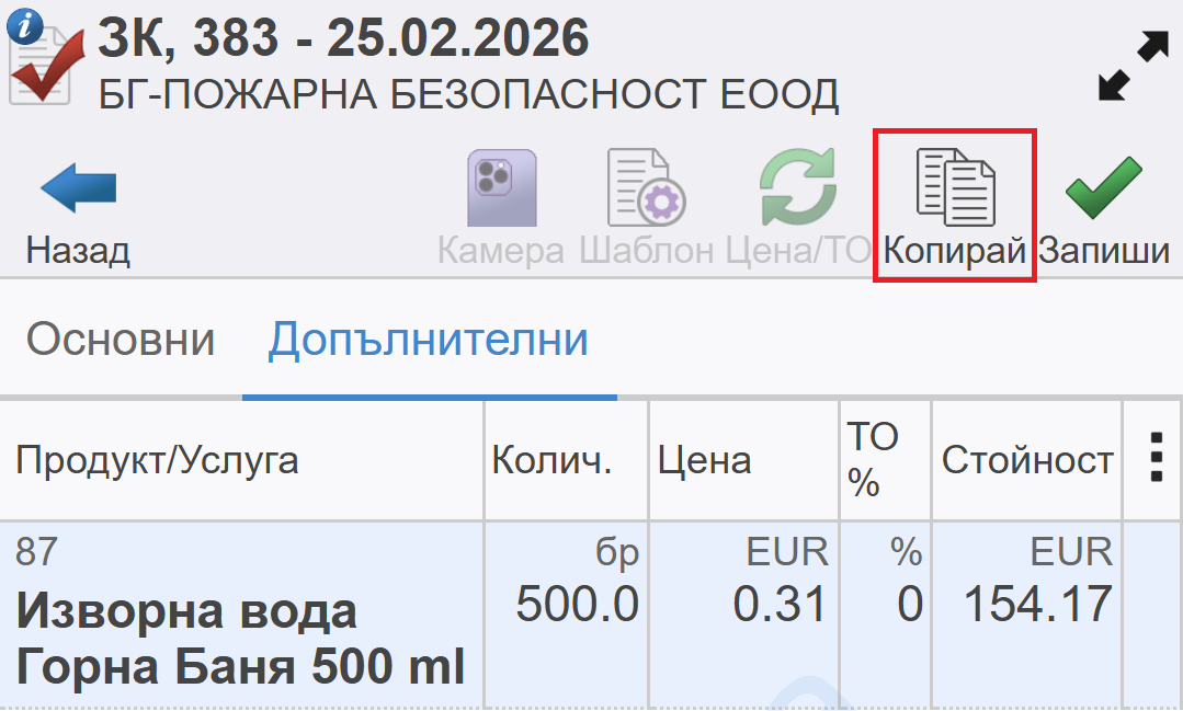 Копие на документ се създава от бутон [Копирай] в лентата с опционални бутони. Тази операция създава нов документ със съдържанието на текущия.