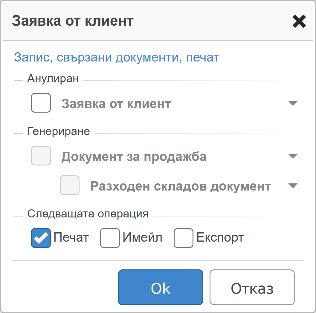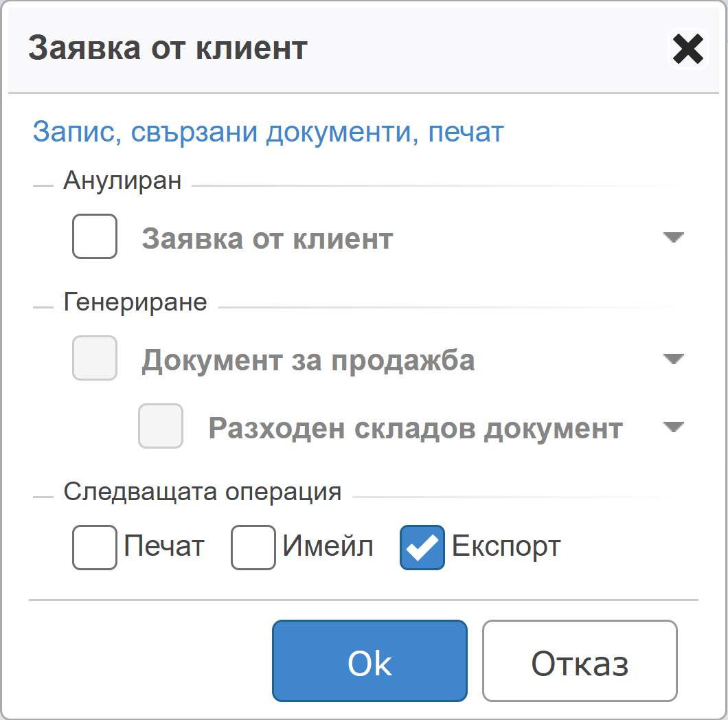 След потвърждаване на избраните опции с бутон [Ok] се отваря форма Избор. Тя съдържа опции за избор на шаблон и тип на файла за експорт (.pdf или .xlsx).