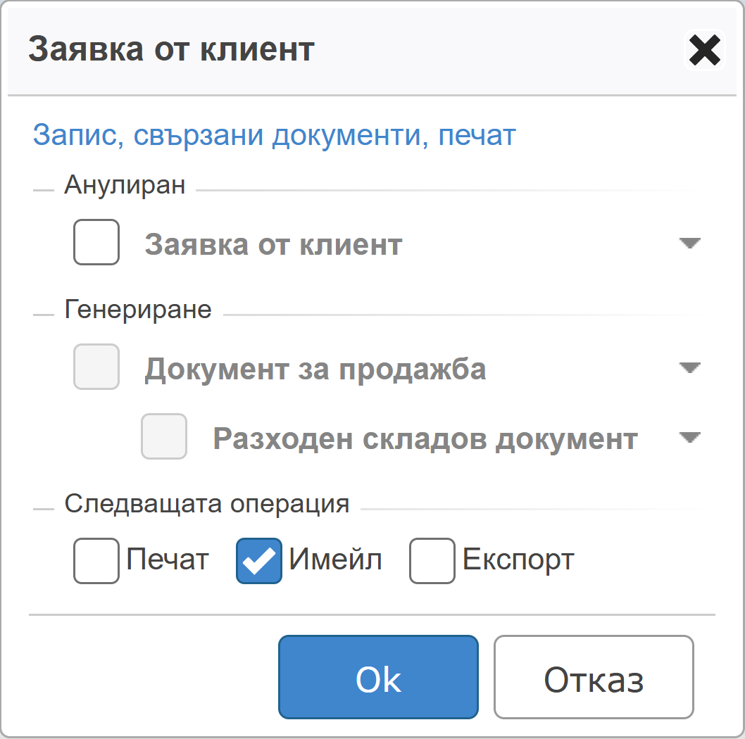 Опцията Имейл е достъпна във формата при запис на документ или в менюто с бутони.