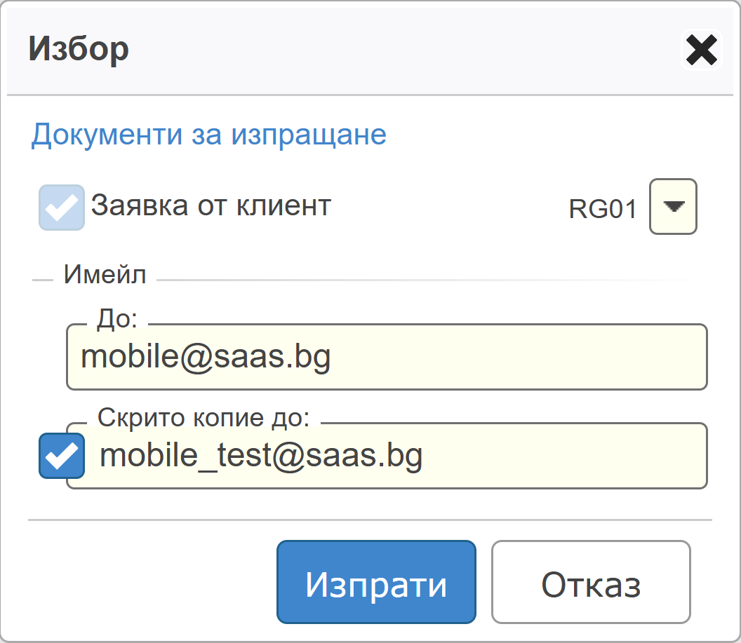 Всеки записан и приключен документ може да бъде изпратен на клиента по имейл. Предварително в бекофис системата може да се въведат имейли за всеки получател. Настройката служи за автоматично попълване на получател при изпращане на документи.