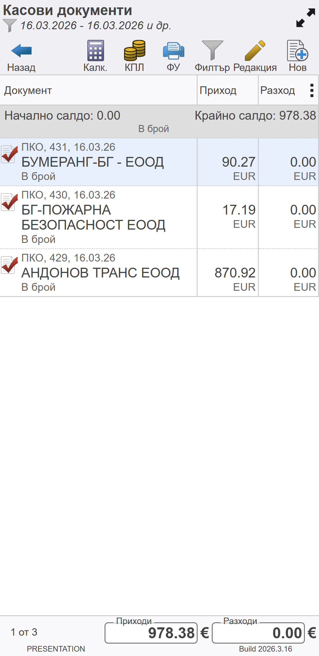 КПЛ - Отваря форма с текуща наличност на касата на подотчетното лице.