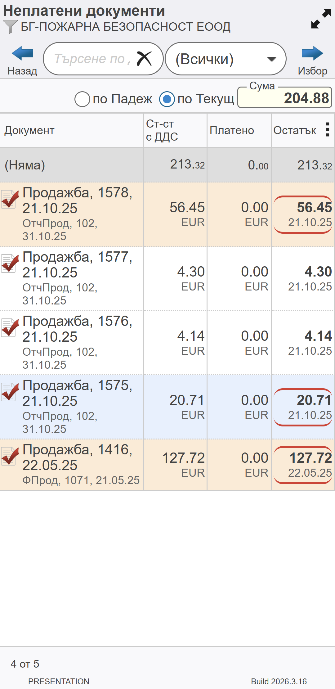 Списъкът съдържа единствено документи с остатък за плащане за избрания контрагент. Системата автоматично маркира тези, на които падежът за плащане е настъпил.