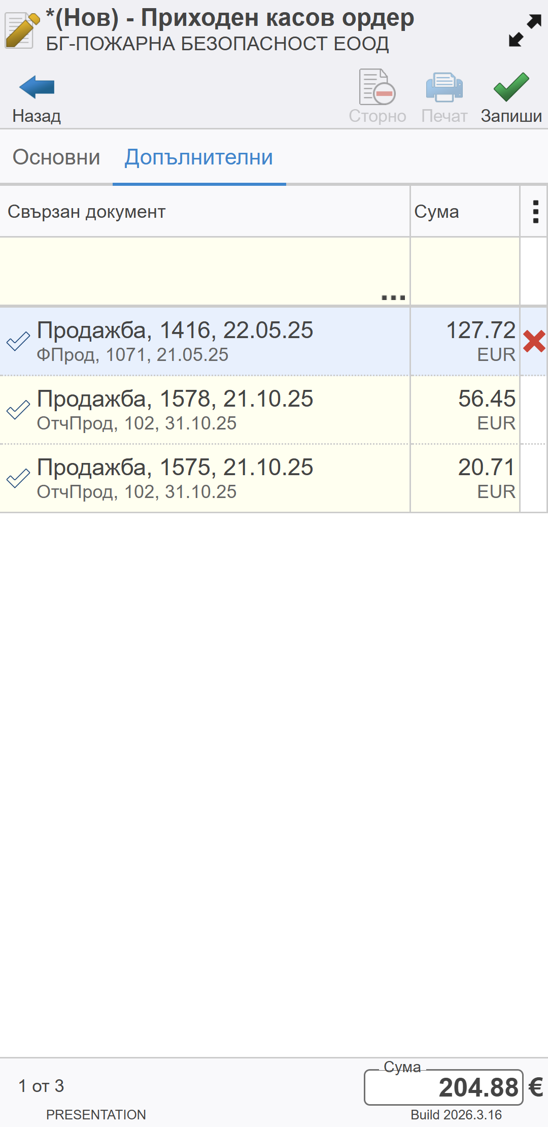 Системата затваря списъка с неплатени документи и добавя избраните записи в касовия ордер.