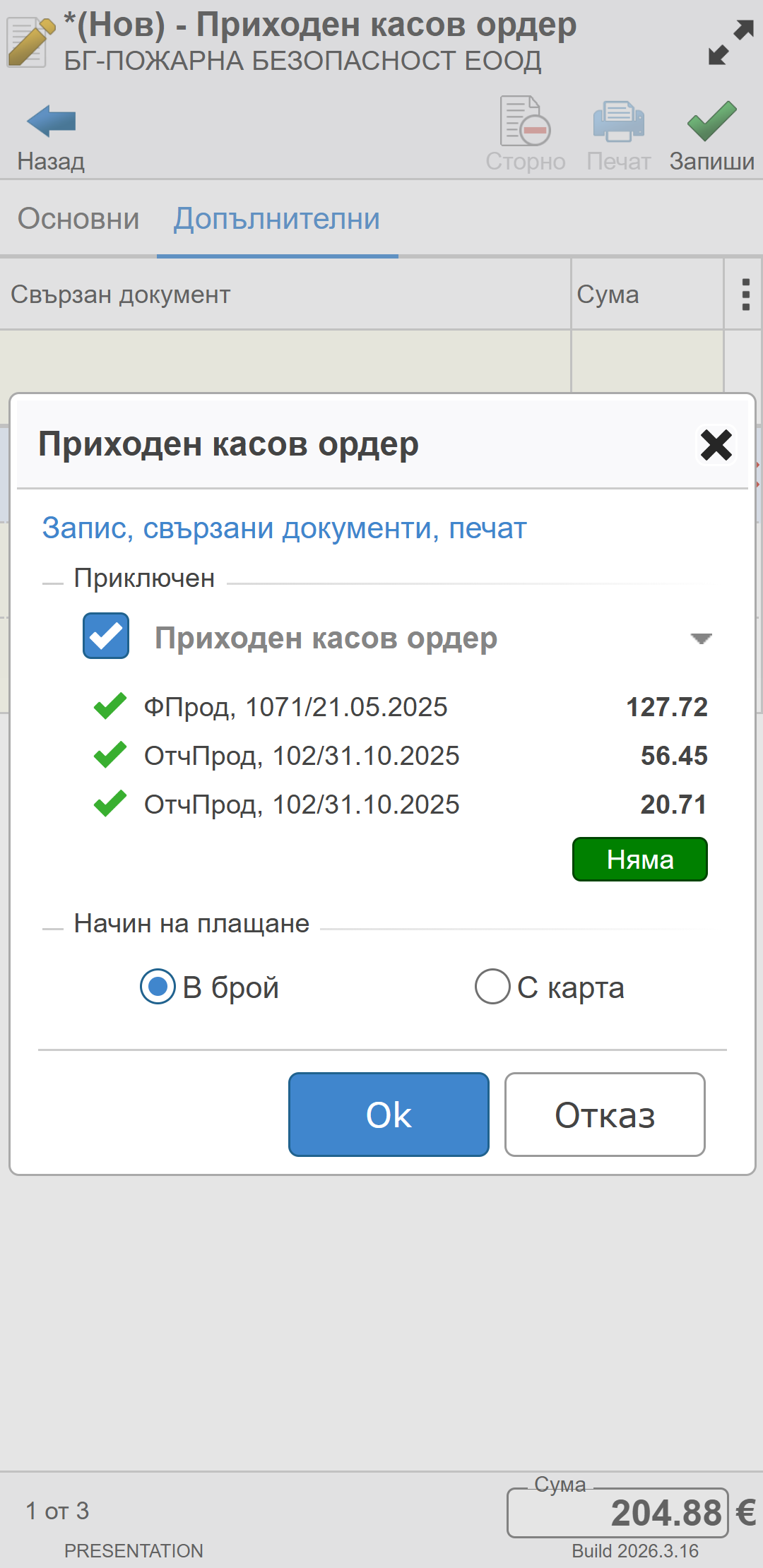 Док. тип - За получено в брой плащане се създава ПКО-Приходен касов ордер.