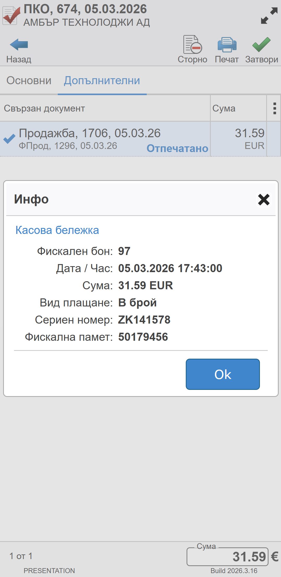Чрез маркиране на текста Отпечатано се отваря форма с данни за касовата бележка: