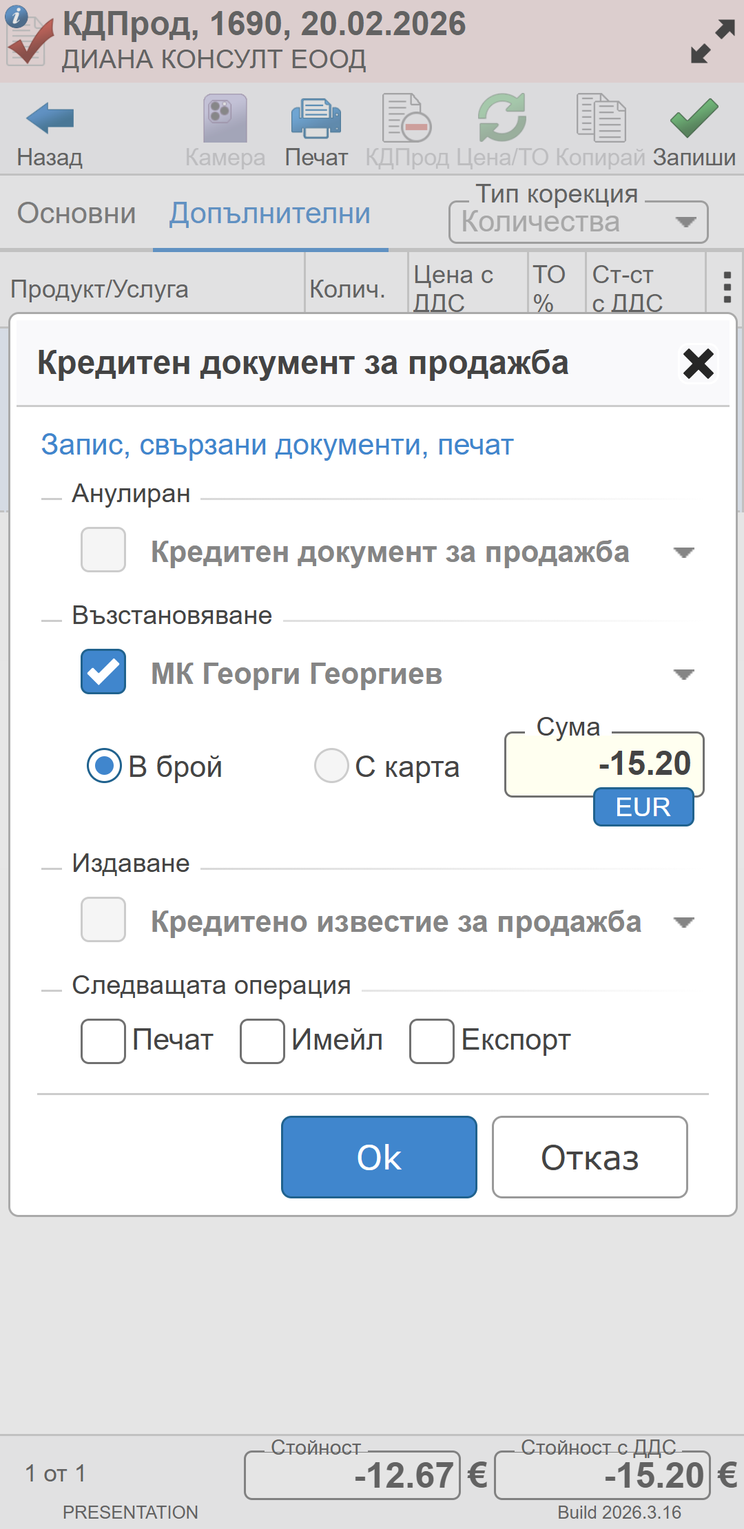 Създава се нов кредитен документ. При неговото приключване от формата за генерация на свързани документи се маркира мобилната каса на оператора в секция Възстановяване. Системата автоматично предлага сумата на КДПрод в поле Сума.