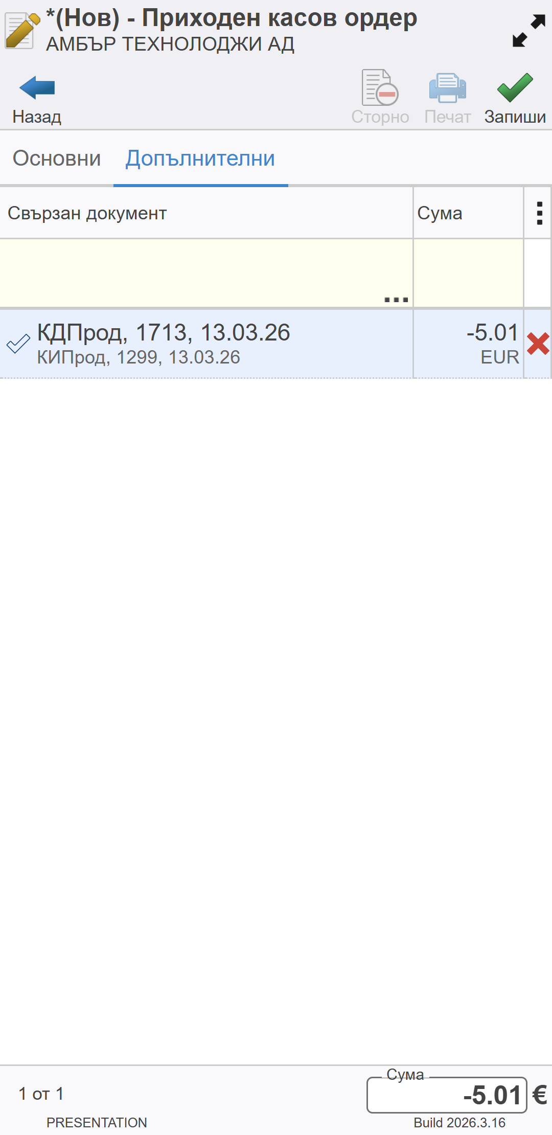 Сторно операциите се регистрират в системата чрез ПКО-Приходен касов ордер с отрицателен знак.