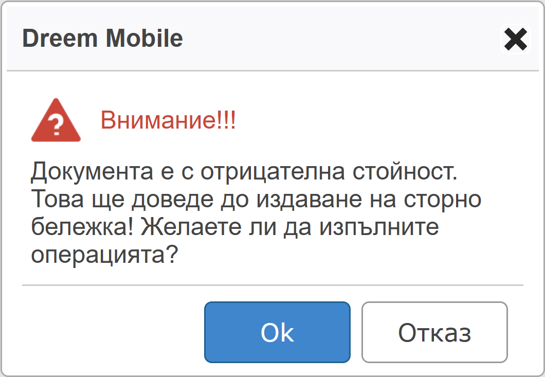 След като всички данни са въведени, документът се приключва чрез бутон [Запиши]. С това системата извежда съобщение и изисква потвърждаване издаването на документ с отрицателна стойност.