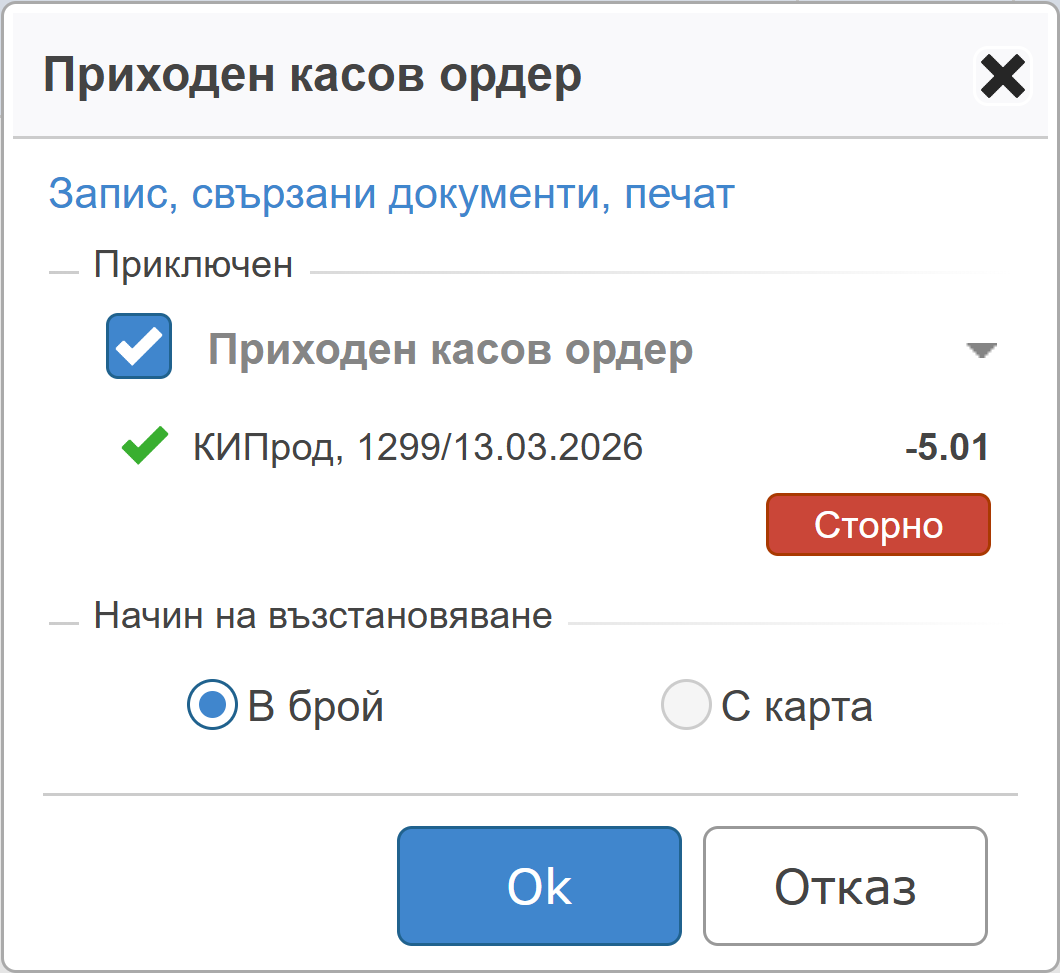 С бутон [Ok] избраните опции се потвърждават. Системата валидира и записва касовия ордер в базата. Успоредно с това се отпечатва сторно бон на ФУ.