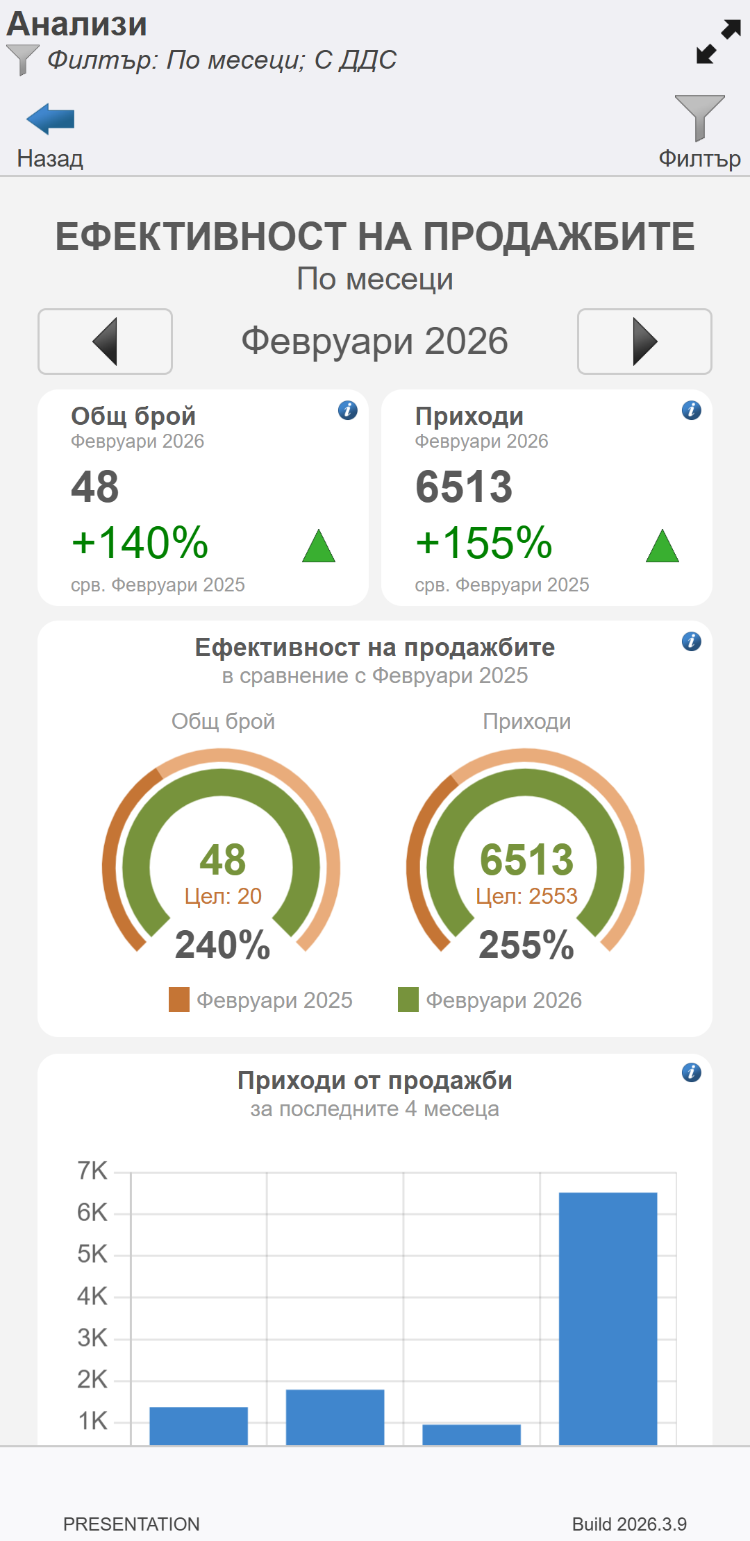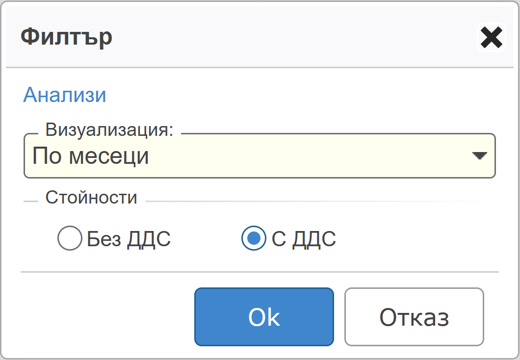 Системата позволява филтриране на данните с или без ДДС по месеци.