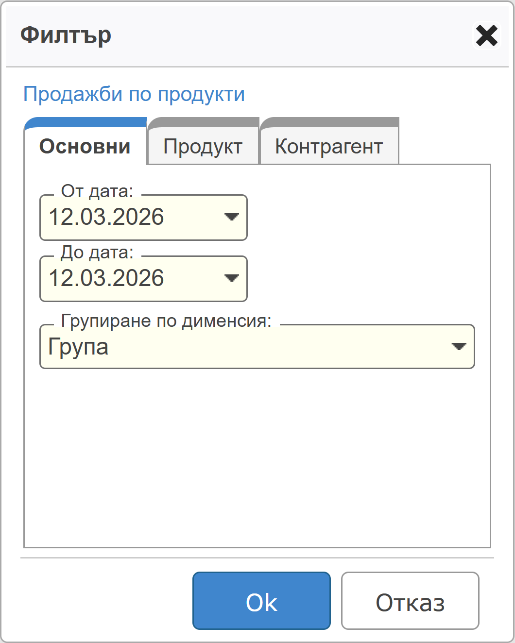Системата позволява филтриране на данните по продукти, дименсии, контрагенти и/или обекти.
