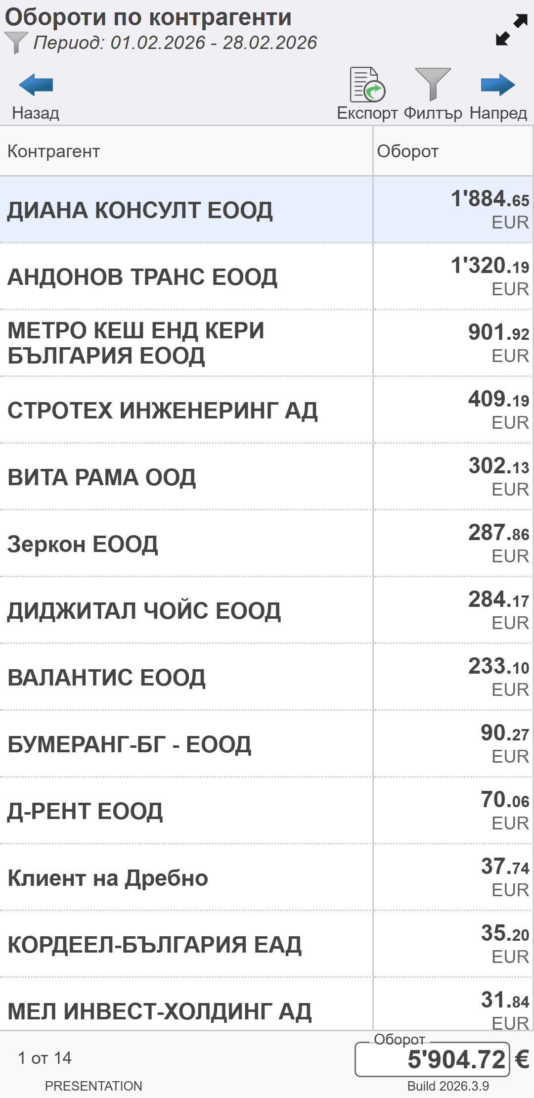 Системата позволява филтриране на данните за период по контрагенти и дименсии.