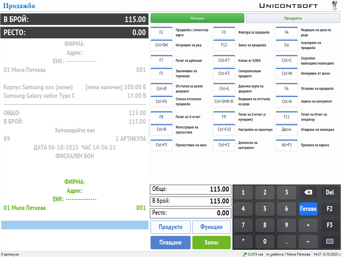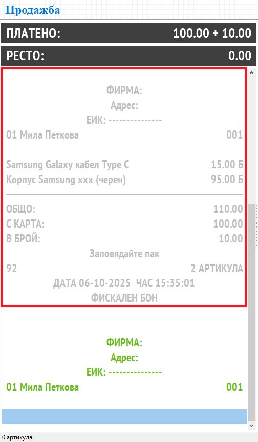 Платено - Полето се обзавежда след приключване на продажбата с платената сума. Показаните стойности при смесено плащане са във вид: сума платено с карта + сума платено в брой.