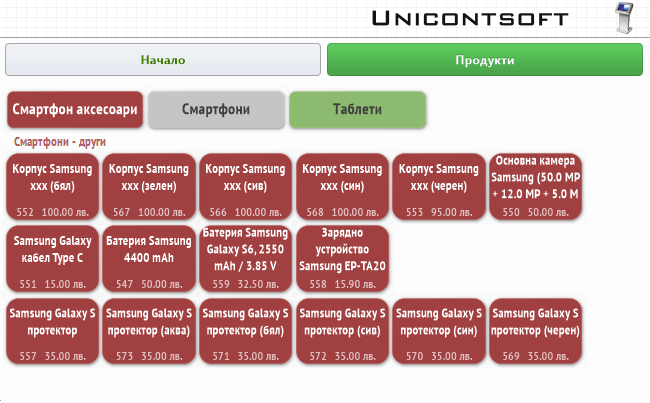 Бутоните се групират по категории продукти. Настройката може да се извърши в бекофис системата Dreem ERP от меню Номенклатури || Медия каталог.