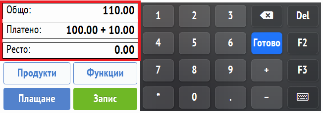 Полетата в тази секция показват на оператора тотали с дължима и платена сума.