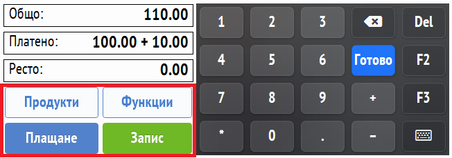 Плащане - Отваря форма с полета за попълване на получените от клиента суми според метода на плащане.