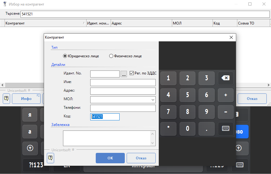 В поле Код автоматично се попълва кодът, използван за търсене на контрагент в списъка.