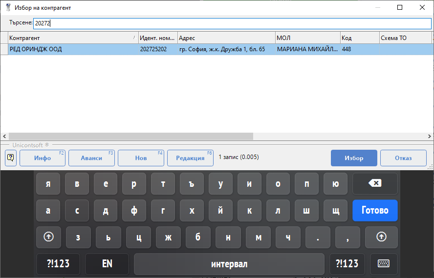Клавиш [F2] или съответстващия му бутон в секция Начало на основния екран - Системата отваря форма за избор на контрагент. Тя съдържа списък с въведените контрагенти, от който се избира клиент. Търсенето на контрагент става по идентификационен номер (БУЛСТАТ), по име или по код.