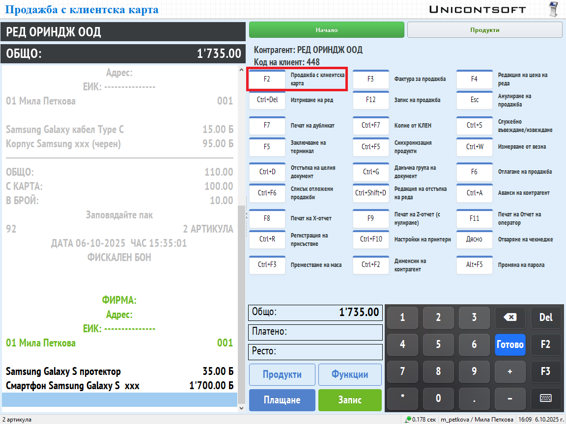 Контрагент може да бъде избран/сменен с [F2] по всяко време на въвеждане на продажбата преди потвърждаване на плащането.