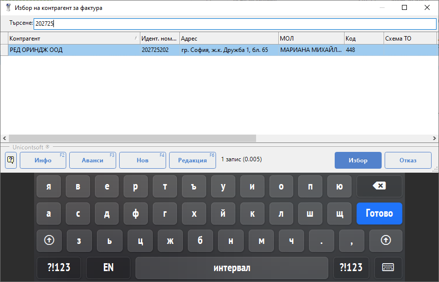 Системата отваря форма Избор на контрагент за фактура. Тя съдържа списък с въведените контрагенти, от който се избира клиент. Търсенето на контрагент става по идентификационен номер (БУЛСТАТ), по име или по код.