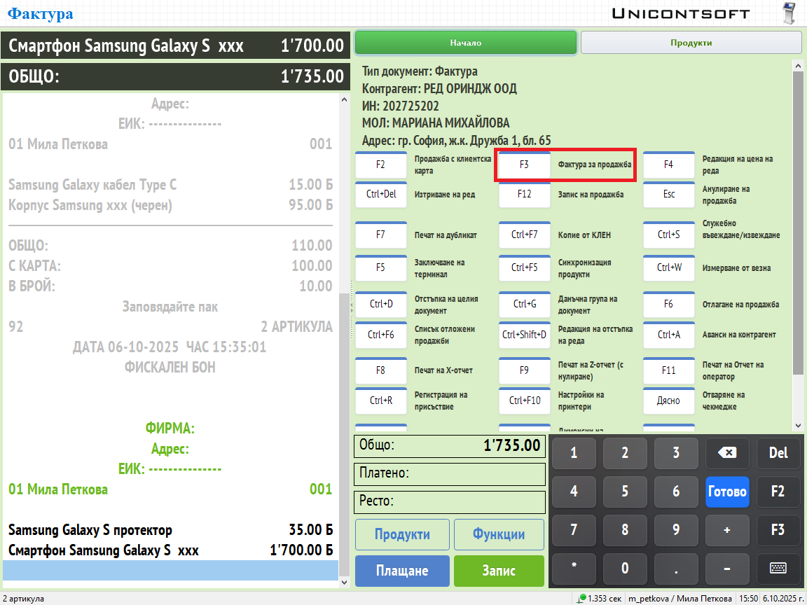 Контрагент може да бъде избран/сменен с [F3] по всяко време на въвеждане на продажбата преди потвърждаване на плащането.