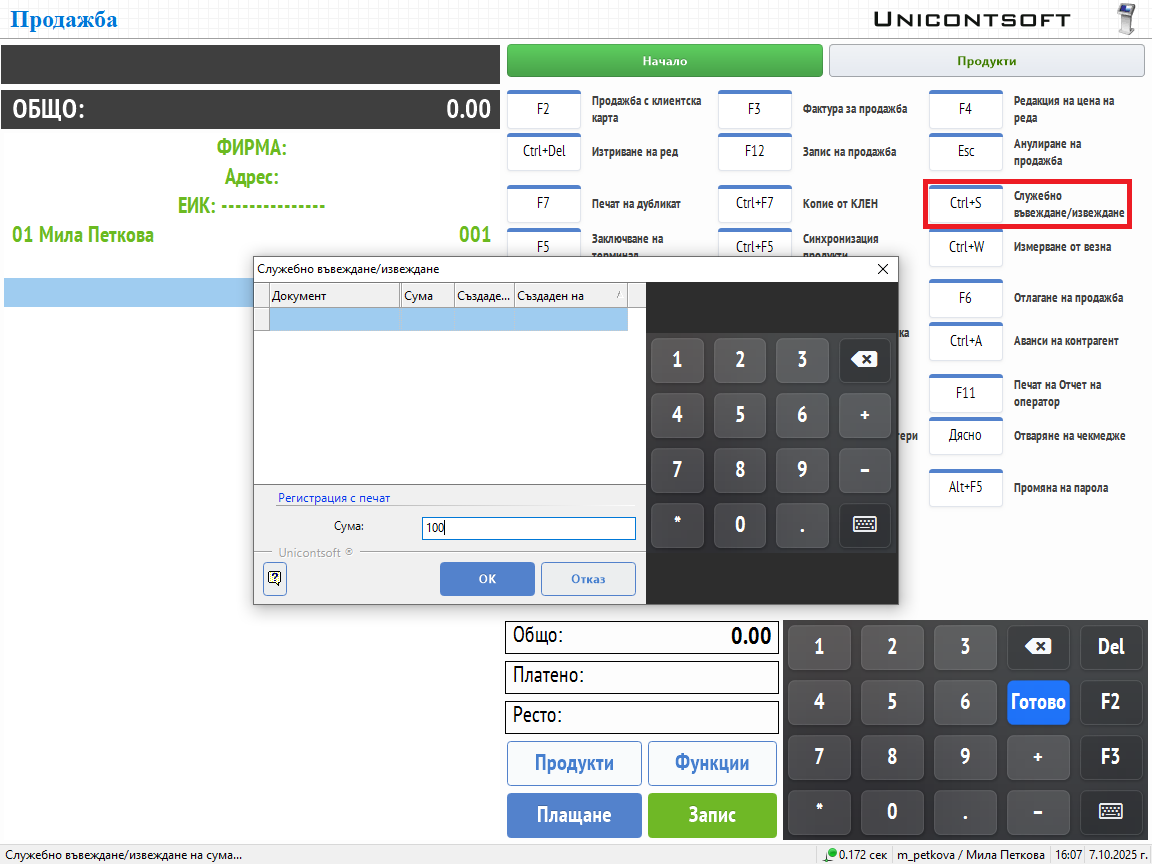 Чрез клавишна комбинация [Ctrl+S] системата извежда форма с поле за попълване на сума.