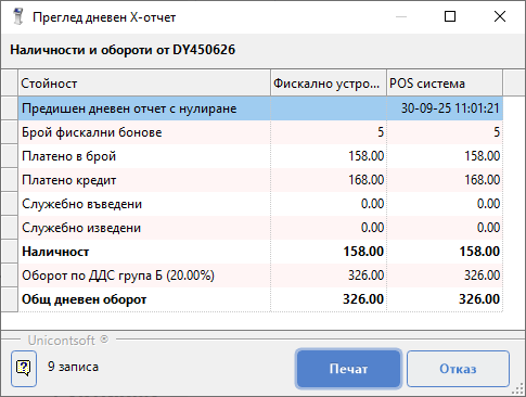С бутон [Печат] се потвърждава разпечатването на Дневен X-отчет.