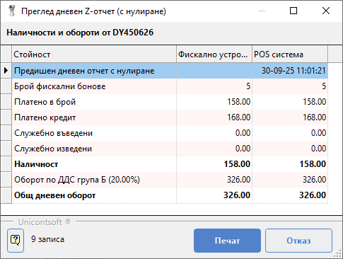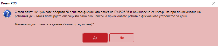 При действително приключване на работа с фискалното устройство се избира бутон [Да]. С това оборотите за деня във фискалната памет се нулират.