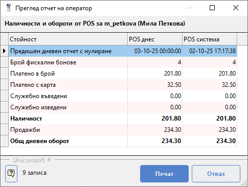 Отчет на оператор показва обороти по видове плащания и типове документи за текущия потребител. Справката е удобна за отчитане на отделните оператори.