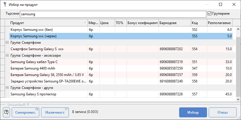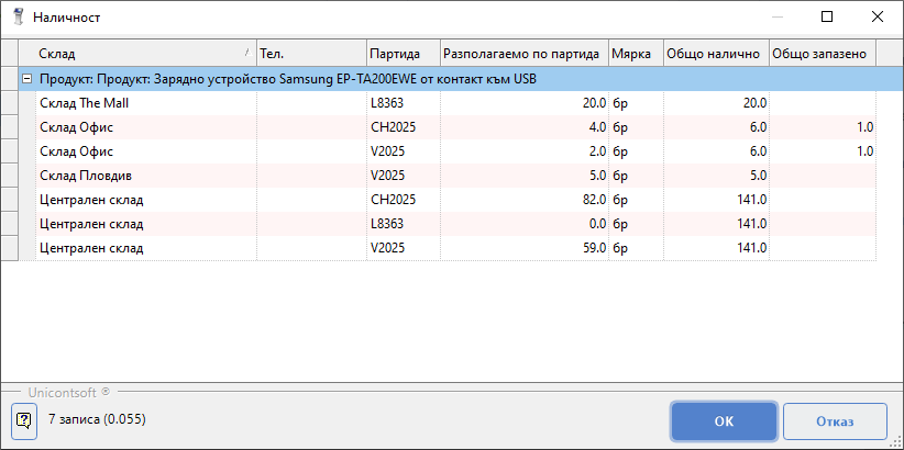 Dreem POS дава възможност за преглед на наличности и в други обекти/складове. Информацията е достъпна отново в списък с продукти. Маркират се един или няколко продукта (клавиш [Ctrl] + ляв бутон на мишката). Чрез бутон [Наличност] или с клавиш [F7] се извежда форма с наличности по партиди за всички обекти/складове.