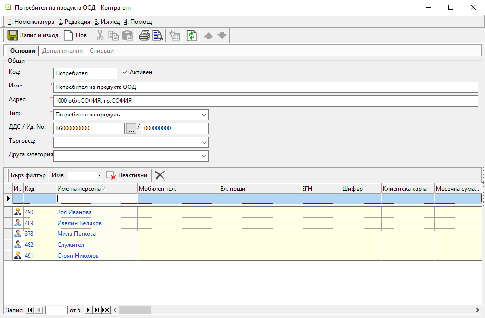 Всички допълнителни данни и корекции на съществуващите се добавят в Номенклатури » Контрагенти от форма за редакция на Потребител на продукта.