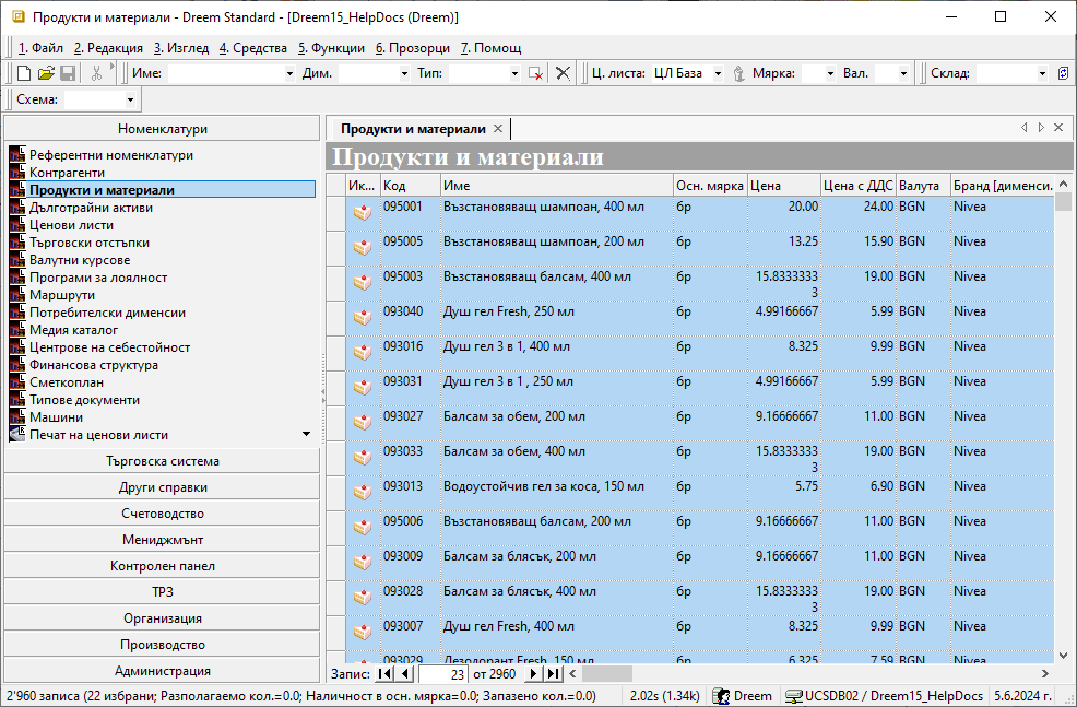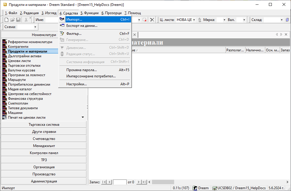 Системата разполага със средство за добавяне на множество нови продукти наведнъж, което ще откриете в Номенклатури » Продукти и материали.