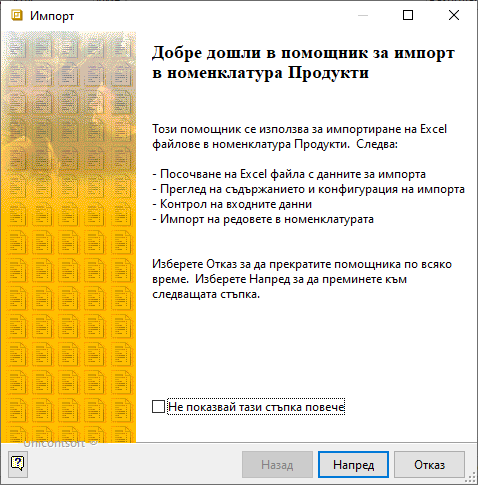 Чрез Импорт става възможно едновременното създаване на продукти с малко усилия. Като могат да бъдат направени множество настройки в основни реквизти, вендор кодове, фасети на мерки, баркодове, прикачени файлове, дименсии, ценови листи.