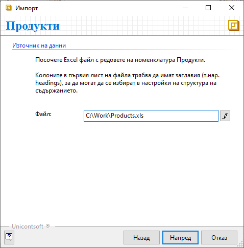 Преминавайки напред, трябва да посочите източник на данни - изберете файла с данни за нови продукти.