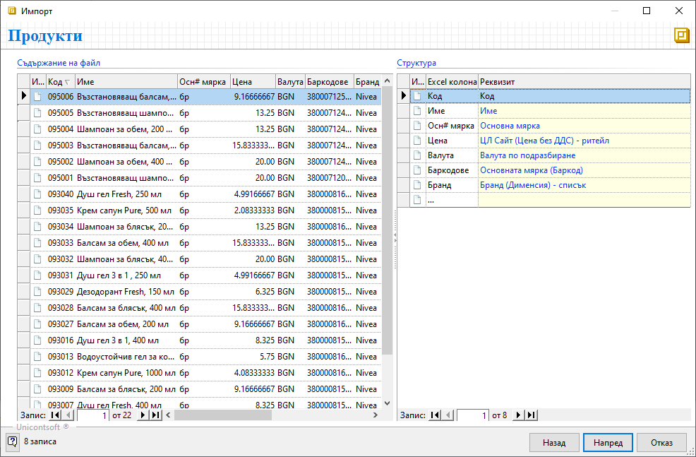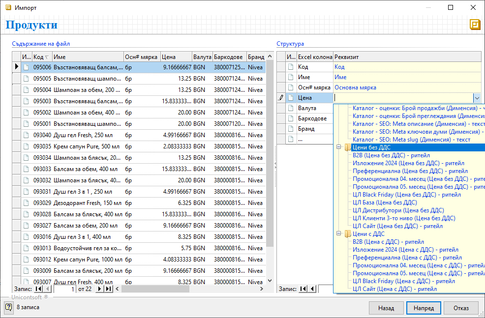 Системата ще покаже съдържанието на файла с продукти, което може да видите като списък вляво. Вашата задача е да конфигурирате импорта чрез списъка вдясно.