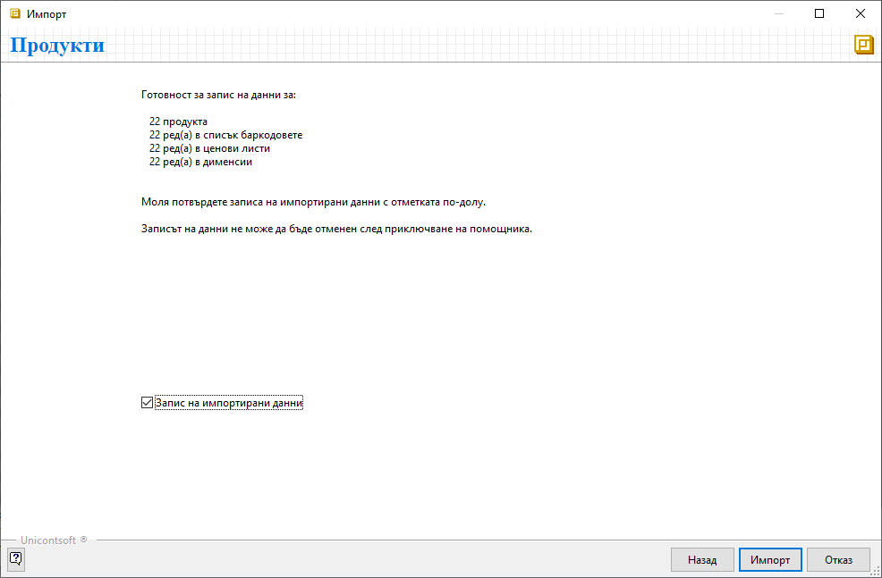 При успешно преминаване, системата извежда опис на записите, които е в готовност да създаде. Ако сте съгласни, поставете отметка при Запис на импортирани данни и потвърдете импорта.