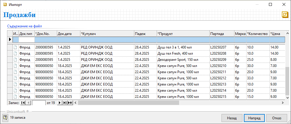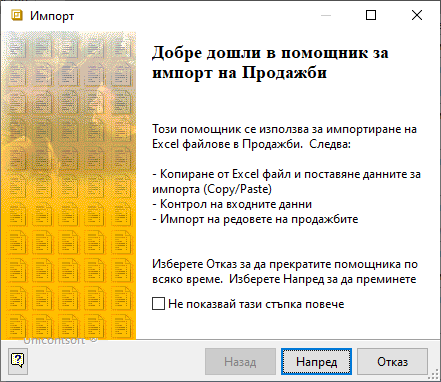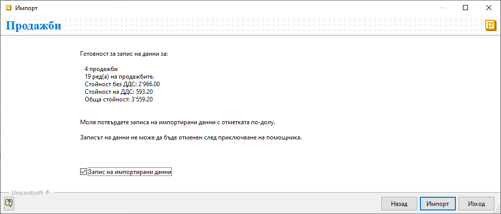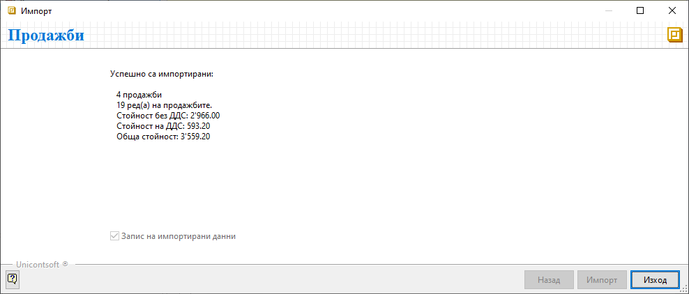 С приключване на процеса по импортиране системата извежда информация за брой добавени продажби и други детайли.